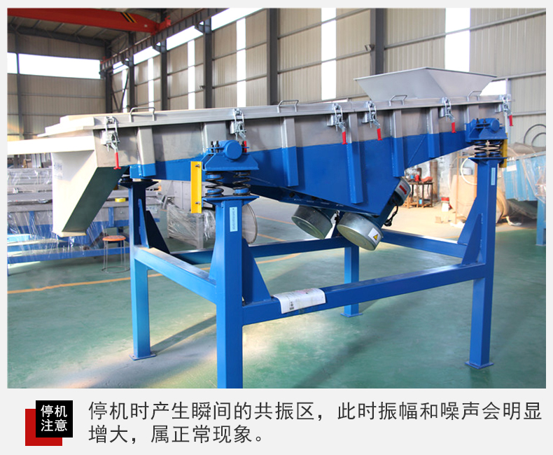 6、設(shè)備在停機時產(chǎn)生瞬間的共振區(qū),此時振幅和噪聲會明顯增大,屬正常現(xiàn)象,設(shè)備在開停機前,篩面上不得有存留物料,篩網(wǎng)需經(jīng)常檢查是否張緊、破損,如有破損要即時更換。